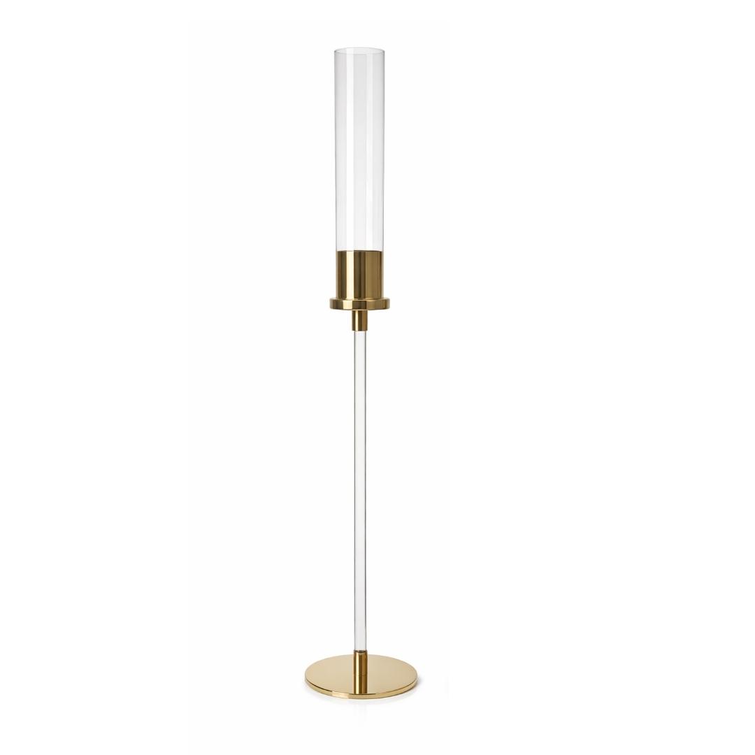 A estrutura alongada valoriza a altura da peça, permitindo que a vela fique em destaque dentro do tubo de vidro, protegida e realçada pela transparência do material. A base metálica dourada proporciona estabilidade e um acabamento luxuoso, enquanto o suporte com donzela agrega charme e personalidade ao castiçal, tornando-o um elemento decorativo de grande impacto visual.