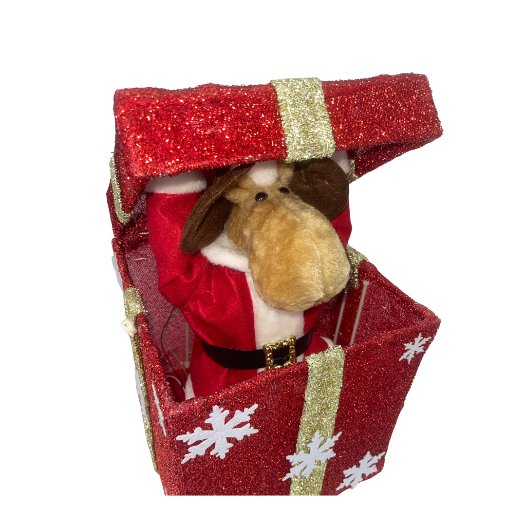 Enfeite Natalino Caixa Presente Alce c/ Som Vermelho 65cm – Decoração Natalina Encantadora e Festiva