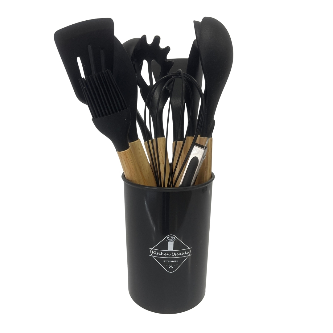 Kit Utensílios de Cozinha em Silicone Preto com Cabo de Madeira – 12 Peças